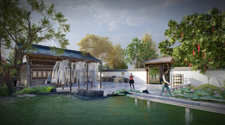 前广场中心位置,是一棵被称为"爱情证词人"的老槐树,将与仿古门楼形成立体叙事空间。未来游客穿过门洞时,虚实相间的建筑透景将营造"抬头见槐影,回首现廊桥"的沉浸动线。情侣们将在老槐树的见证下互结连理,情定终生。
